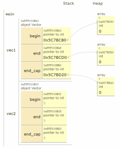 The vector class of C++ has 3 pointers inside it that refer to begin, end, and the end of the allocated memory, so when we perform a move operation we are just getting all the data from these 3 pointers from vec1 and telling to the vec2 appoint to these addresses, below you can see a gif representing that movement.
