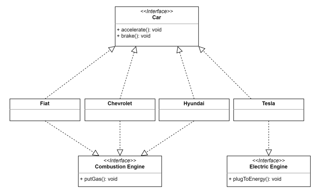Here we are creating a new class called “Tesla” and implementing the same interface on it. The problem is we’ll need to create a method called plugToEnergy() in Car interface because Teslas won’t use the putGas() method at all.